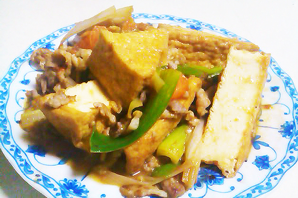 葱がしんなりしてきたら、トマトと厚揚げを入れる。