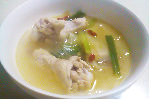 鶏肉がきつね色になったらお酒をいれ、沸騰したら水を入れて弱火にし10分ほど煮込んで完成。